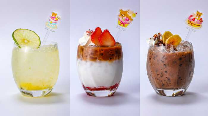 コラボドリンクは3種類、各1,500円で提供。リラックマのチョコバナナスムージー、コリラックマのいちごミルクティー、キイロイトリのゆずレモンスカッシュが楽しめます。