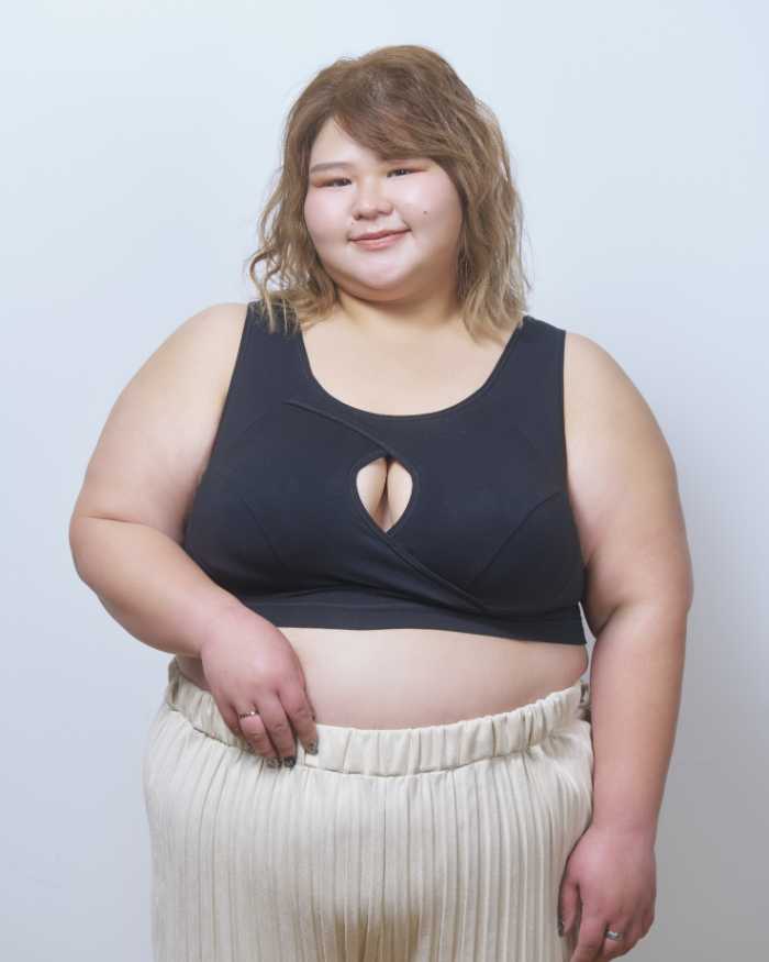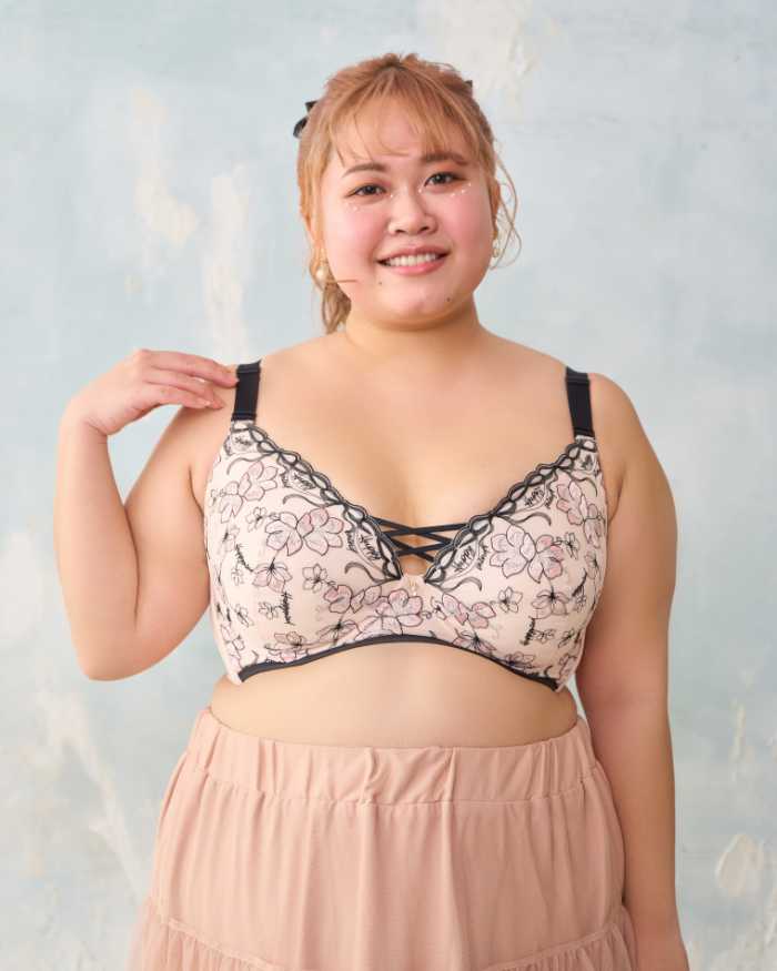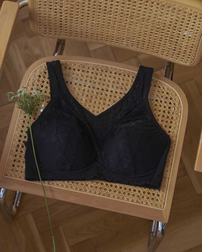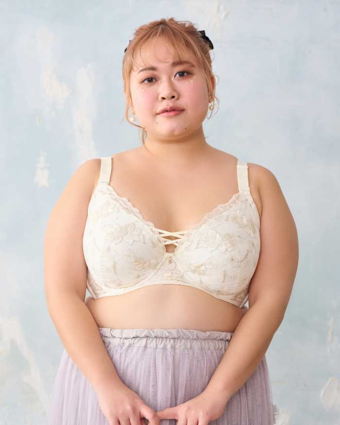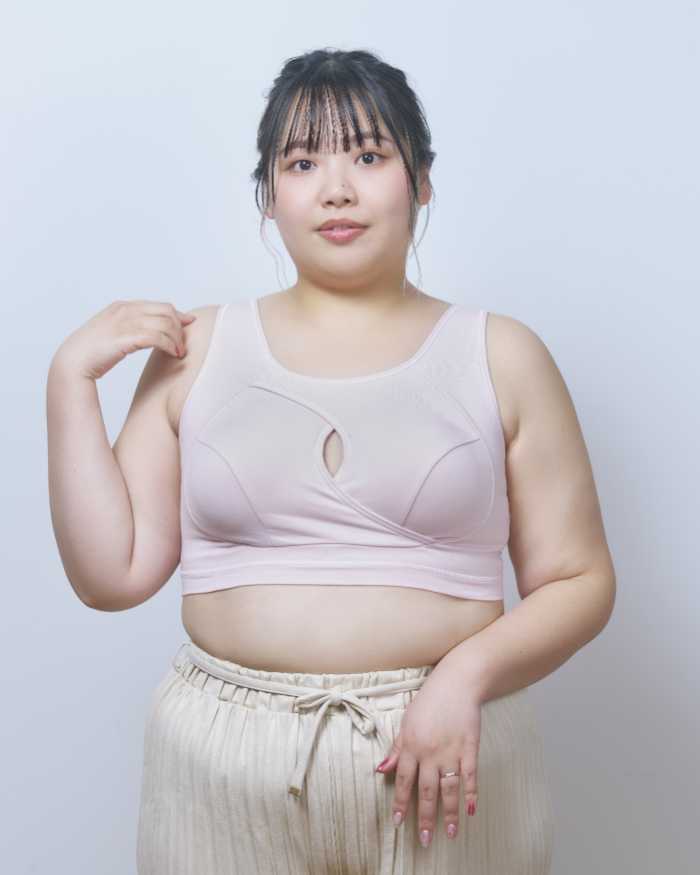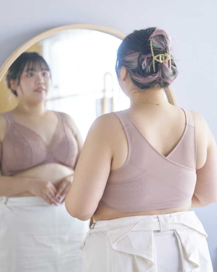 背中のクロスパネルが姿勢を整えながら、ノンワイヤーでラクに美しいシルエットを叶えます。