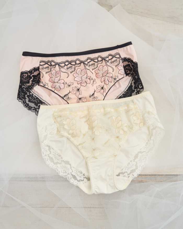 品番90618はピンクとアイボリーの2色展開で、“Happy Mind”の刺繍がポイント。ブラは同じくC85~H105、価格は7,150円~7,700円(税込)、ショーツ(90619)はLL~10Lで2,530円~2,970円(税込)。