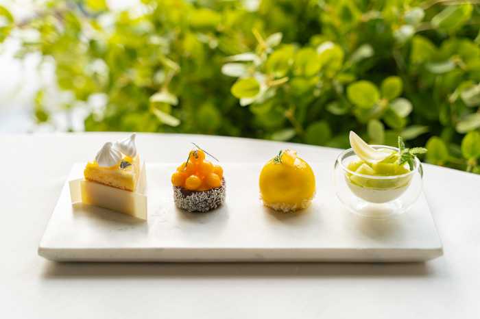 レモンメレンゲパイジャクソンガーデン風/完熟マンゴーとココナツのタルト/オレンジとパッションフルーツのムース/メロンとミントのブランマンジェ