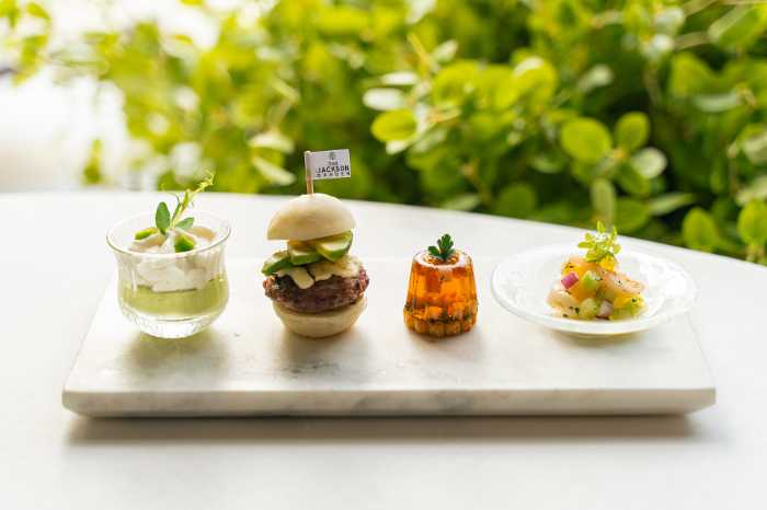 新玉ねぎのエスプーマとそら豆のスープ/和牛アボカドバーガーwithホワイトチェダーチーズ/ジャンボンペルシエジャクソンガーデンスタイル/天使の海老と日向夏のセビーチェ