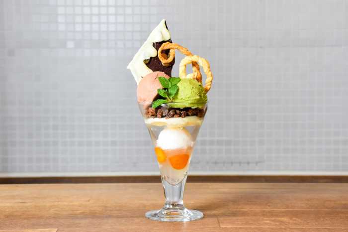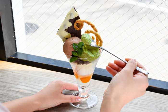 パフェの上部では、緑茶チョコレートとフルーティなミルクチョコレートの2種のアイスが主役。