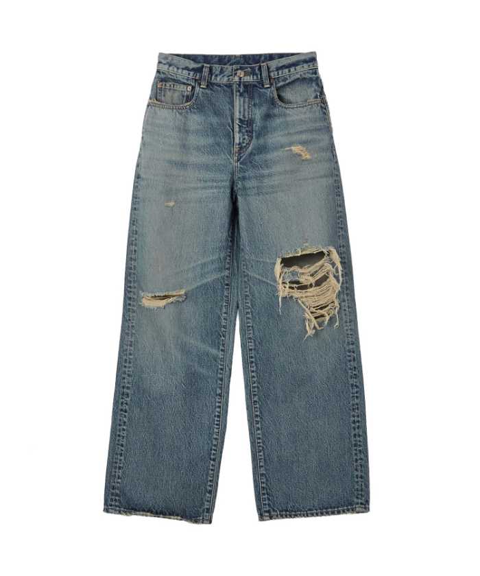 ダメージや色落ちの表現も一本一本丁寧に施され、まるで長年穿き込んだかのような風合いに仕上がっています。個性を引き出すクラッシュ加工や陰影のあるディテールもポイントです。