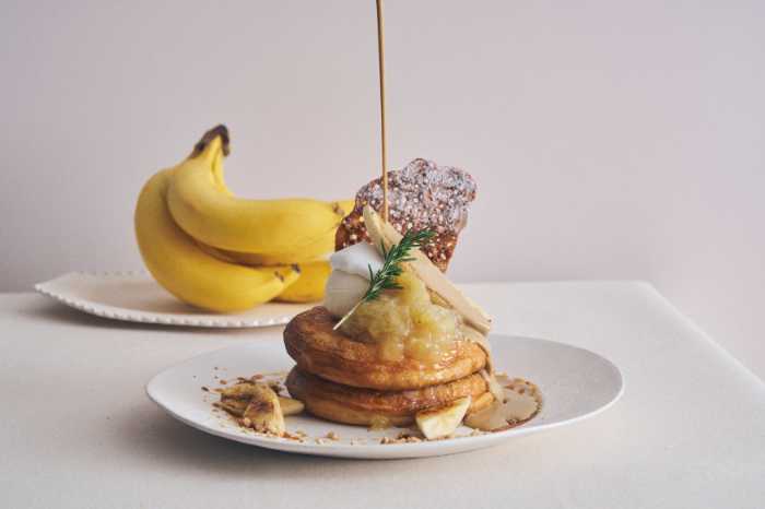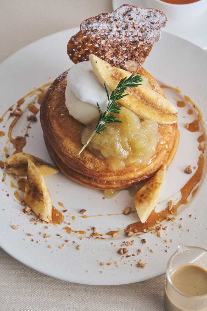 キャラメルバナナとバナナコンフィチュールのパンケーキ ほうじ茶カスタードソース
