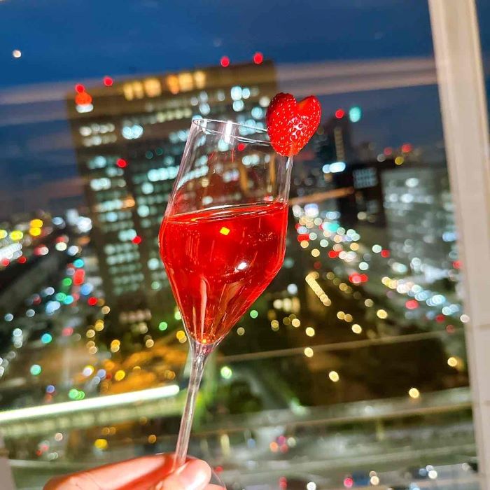 いちごシロップの甘みに、レモンジュースの爽やかさが重なるノンアルコールの一杯。ベースにはノンアルコールのスパークリングワインを使用しています。華やかな夜景と一緒にお楽しみください。