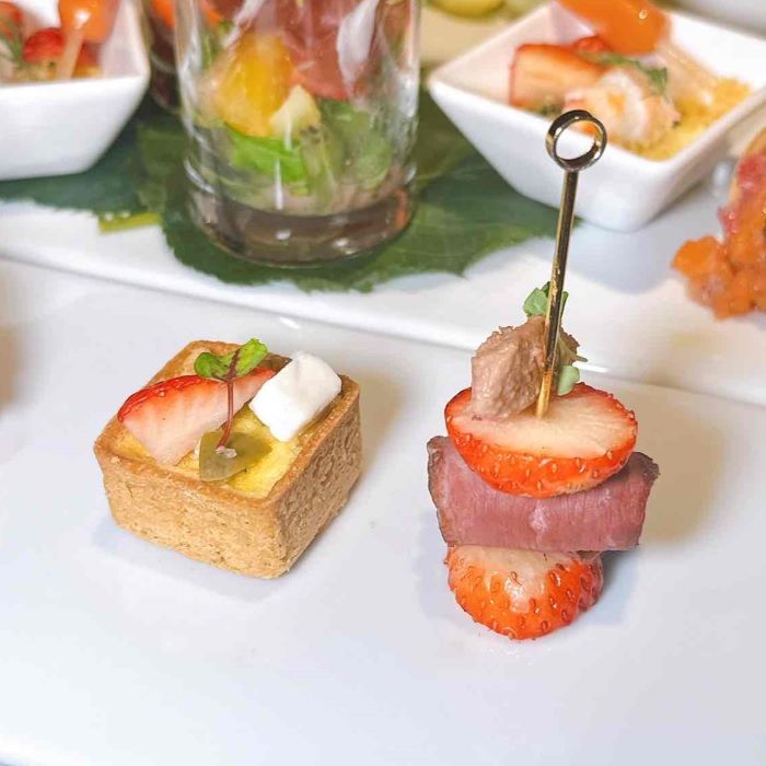 《鴨肉とフォアグラのムース、いちごのピンチョス》 クリーミーで滑らかなフォアグラのムースと、鴨肉の深みのある旨みが重なり合う一品。とても可愛いピンチョスは、いちごの爽やかな風味が素材の持ち味をより一層引き立てています。