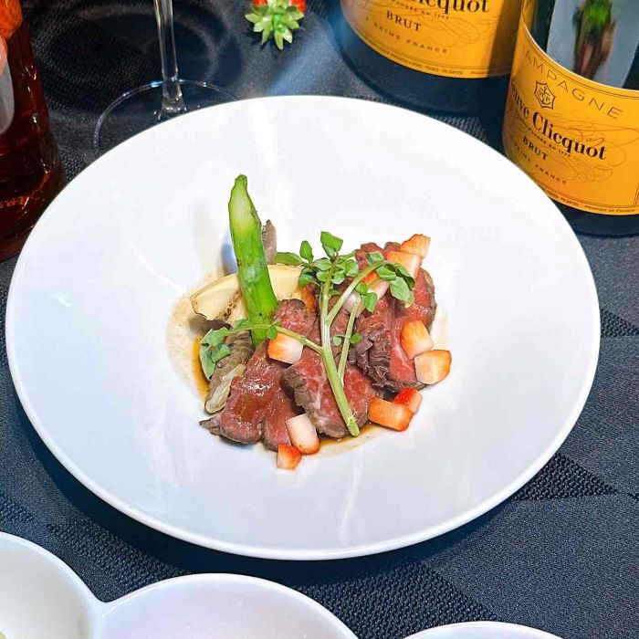 《国産牛ローストビーフ、いちごとマルサラ酒のソース》