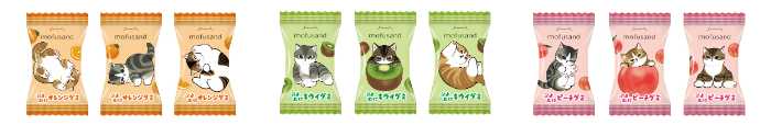 mofusandのにゃんこたちがパッケージや個包装に登場。各フレーバーごとに3種類のデザインがランダムで入っているので、どれが出るか開ける楽しみもあります。