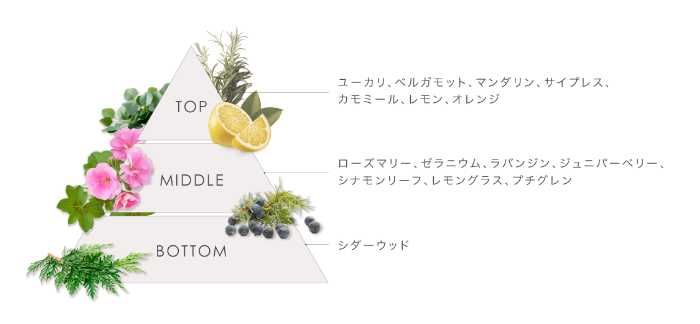 ユーカリやベルガモット、マンダリンのフレッシュさに、ローズマリーやラバンジンのリラックス感をプラスし、心地よく深呼吸したくなるような香りに仕上がっています。