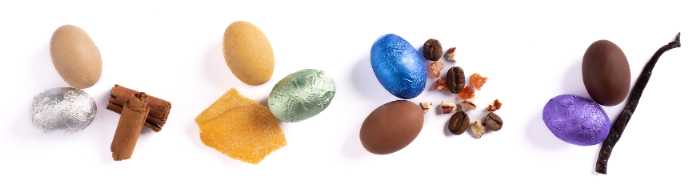 ミニエッグチョコレートは4種のフレーバー展開。ペア&シナモン、マンゴー&ジンジャー、ピーカンナッツ入りミルクチョコレート、ダークチョコレートなど、個性豊かな味わいが魅力です。