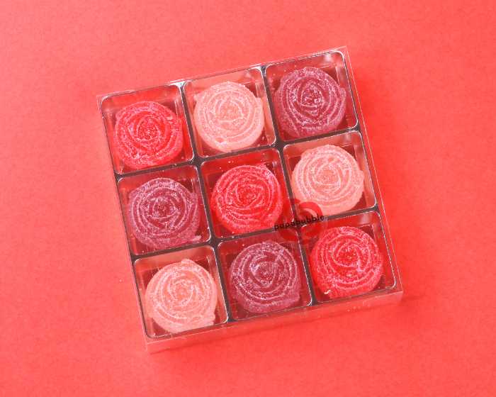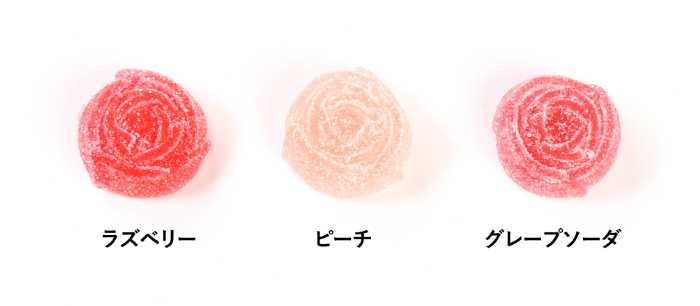 「カーネーションバブレッツ」は2個360円、9個1,600円(税込)。ラズベリー、ピーチ、グレープソーダの3種のフレーバーで、それぞれに花言葉の意味を込めた特別仕様です。
