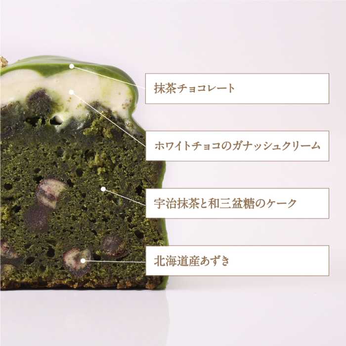 ケークには北海道産あずきをアクセントとして加え、さらにホワイトチョコのガナッシュクリームを絞り、抹茶チョコレートでコーティング。