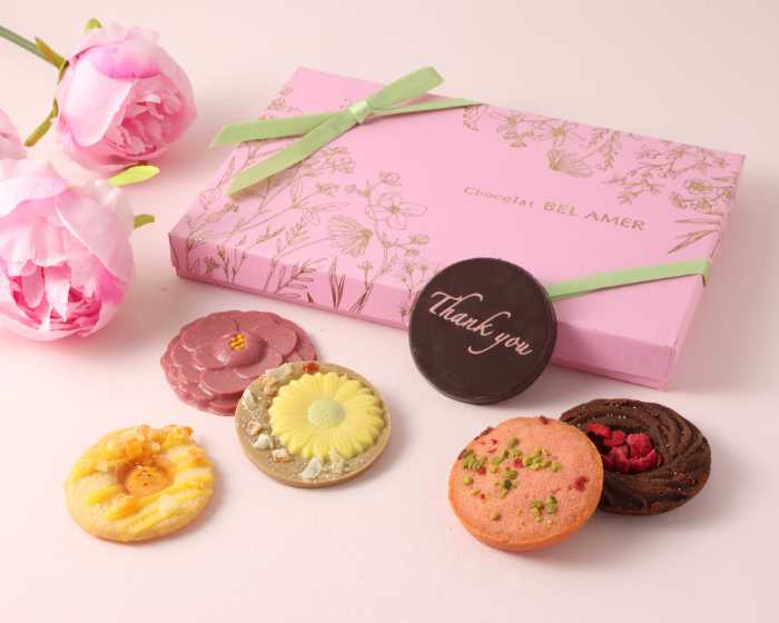 花型ショコラや「Thank you」のメッセージ入りチョコが、感謝の気持ちをやさしく伝えてくれます。見た目も華やかで、贈り物にぴったりな一品です。