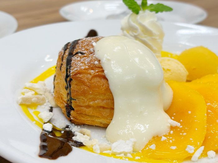 マンゴーやマンゴーソルベ、マンゴーソースを彩りよく盛り合わせ、焼きたてのデニッシュにレモンチーズクリームをとろ~り。