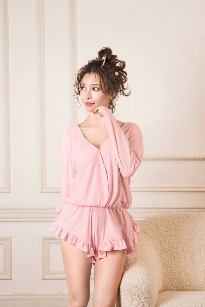 「Belle Drape Rompers」は13,200円(税込)。フリーサイズで、LIGHTGRAYとPINKの2色展開です。フリルやドレープが美しく、リラックスタイムを優雅に彩ります。