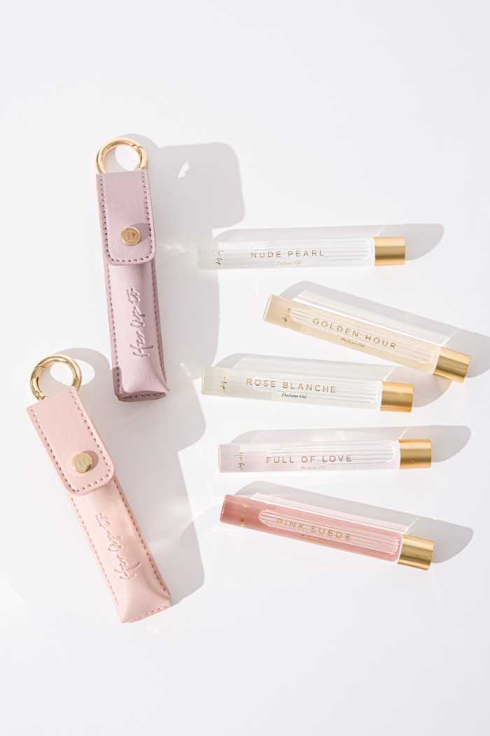 ロールオンパフュームオイル5種(NUDE PEARL/GOLDEN HOUR/ROSE BLANCHE/FULL OF LOVE/PINK SUEDE)と、キーリング付きケースのセットも登場。