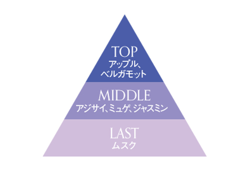 香りは、雨上がりの空気を思わせる爽やかなアジサイの香り。トップにはアップルやベルガモットが軽やかに香り、続いてみずみずしいフローラルが広がります。
