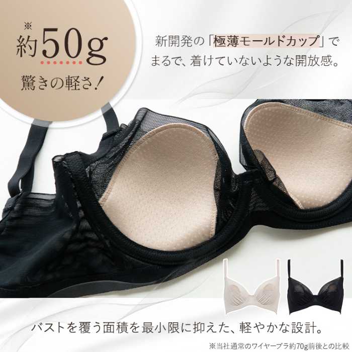 新開発の極薄モールドカップを採用し、バストを覆う面積を最小限に。約50gの軽量設計で、まるで着けていないような開放感を実現しています。