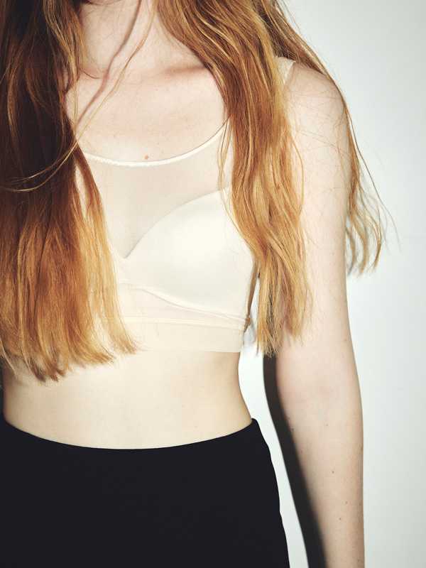 ワイヤーや平ゴムを使用せず、ハイパワーストレッチ素材でバストをやさしくホールド。