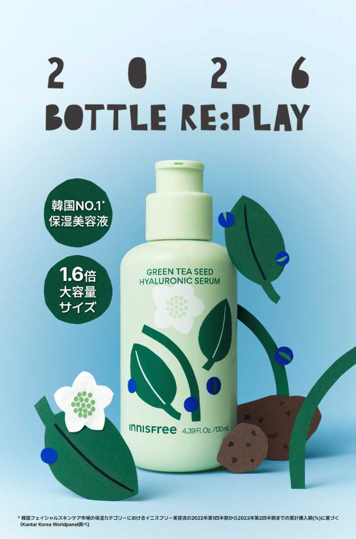 今回発売される「グリーンティーシード ヒアルロン セラム BOTTLE REPLAY EDITION」は、回収した空き容器を再利用したサステナブルパッケージを採用。