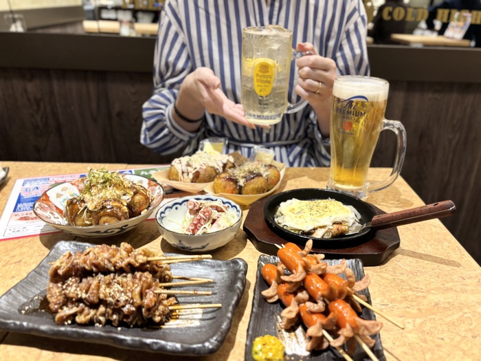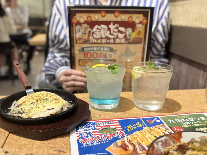 「銀だこハイボール酒場」。ネーミング通り、ハイボールやお酒と相性の良いお料理は、たこ焼のみならず一品メニューもバラエティ豊か!オーダーするのにもテンションがあがります。