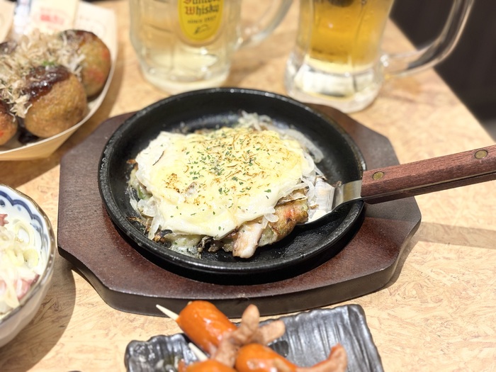 鉄板メニュー「たこ焼」表面パリッと、中はトロッとジュワ旨!クリーミーで明太子のピリッと感がやみつきな「チーズ明太子」、4個入りなので気軽にオーダーできるのも嬉しいですね。