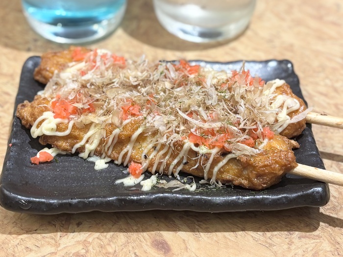 たことお魚のおいしさをダブルで味わえる「たこつくね串」でお祭り気分♪ふわふわの削り節とさっぱりとした紅生姜がアクセントなり、ビールをおかわりしたくなりました。