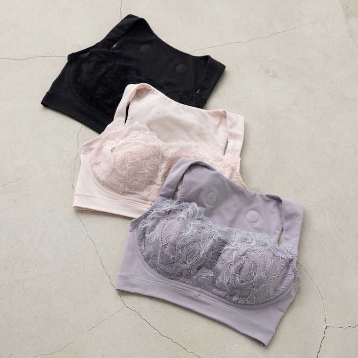 背面に8つの磁石を内蔵し、肩甲骨まわりのコリにアプローチ。ノンワイヤーながらバストをしっかり支える設計で、快適な着用感を実現しています。