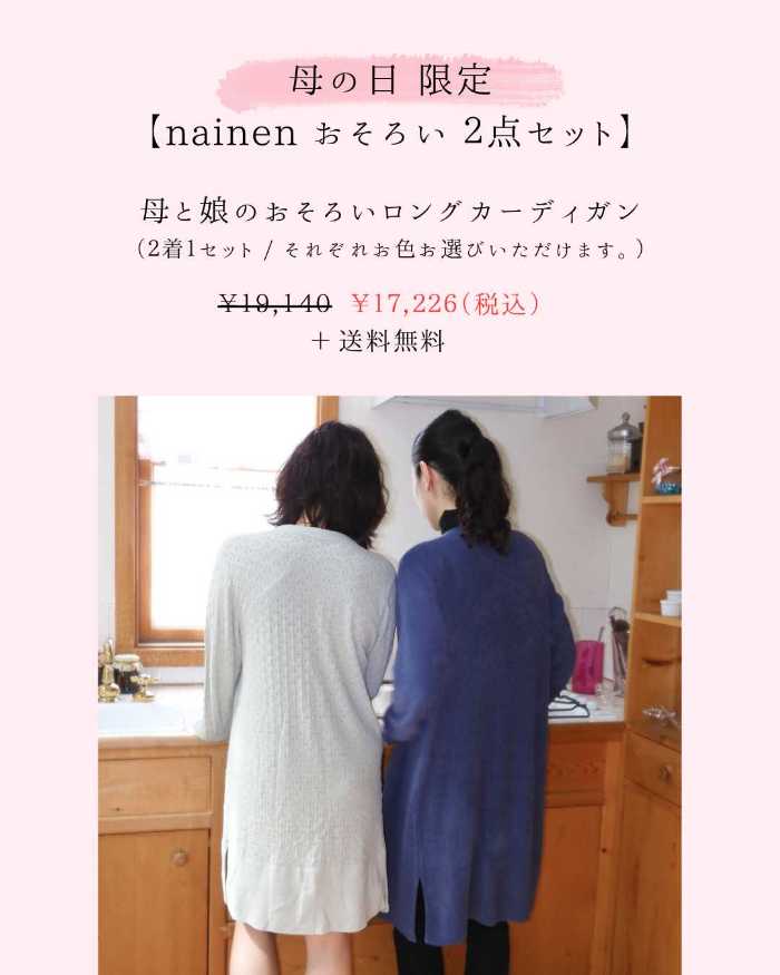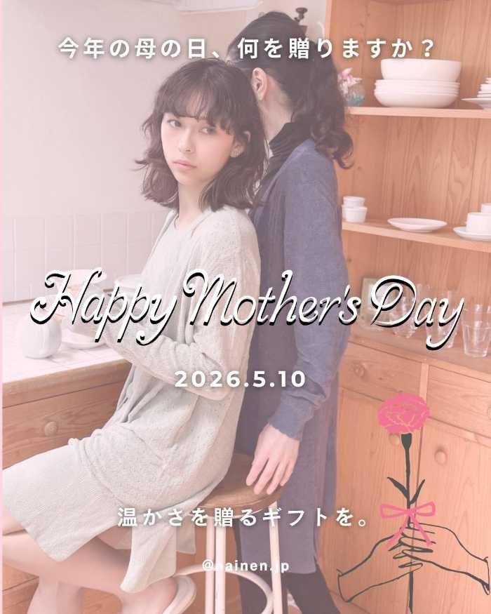 母の日の贈り物に、今年は“あたたかさ”をプラスしてみませんか♡ニットランジェリーブランド「nainen(ナイネン)」から、母と娘で楽しめるおそろいセットが登場。2026年4月13日(月)~5月11日(月)の期間限定で、人気のロングカーディガンがお得に手に入る特別企画です。寒暖差のある季節に嬉しい温活アイテムで、心も体もほっとするギフトを♪
