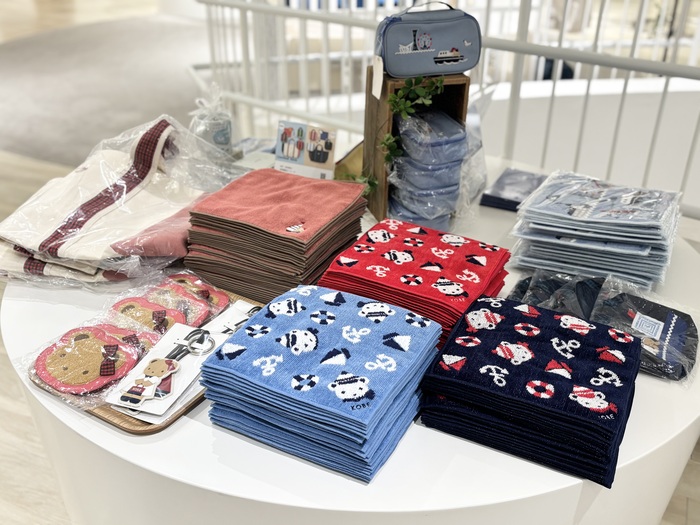 可愛らしいファミちゃんのお顔と神戸にまつわるアイテムが描かれた「タオルハンカチ」や「ポーチ」は、神戸限定アイテムです。