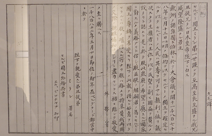 セルビアと日本の交流は140年以上に及びます。1882年に、当時のセルビア国王ミラン・オブレノヴィッチ1世と明治天皇が書簡を交わし、友好関係が始まったことにも触れられ、大使館にもその際の手紙が展示されています。