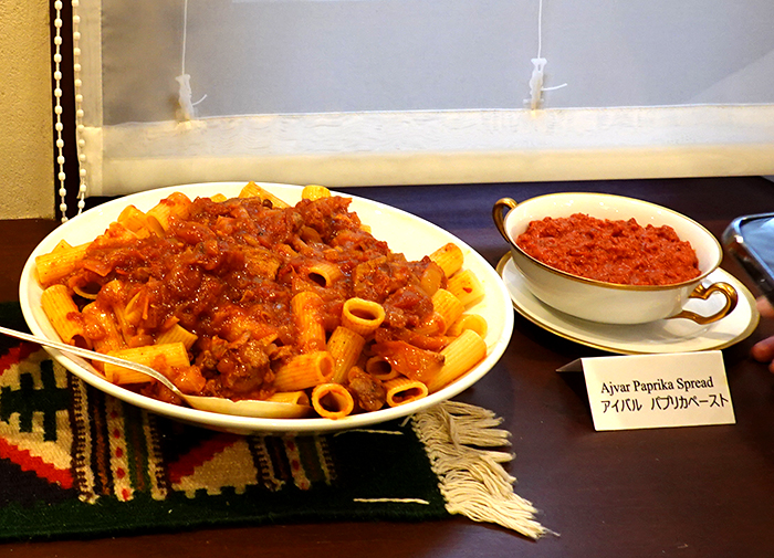 会場で振る舞われた料理にも、鮮やかな赤が印象的な一皿が並びました。代表的なのが、焼いたパプリカをペースト状にした「アイバル」。甘みとほのかな燻香が重なり、パンや肉料理に添えるだけで味わいに奥行きが生まれます。素材の力強さを素直に感じられる味でした。