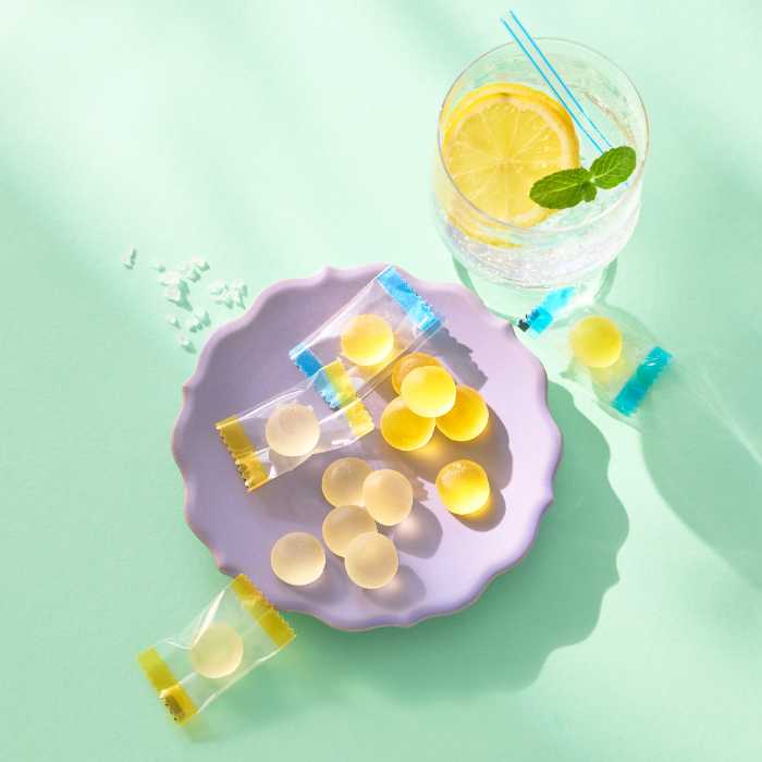 瀬戸内レモン果汁を使用した2層仕立てで、塩レモングミとレモンスカッシュグミの2種類を詰め合わせています。