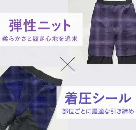独自の弾性ニットと着圧シールを組み合わせ、部位ごとに最適なサポートを実現。