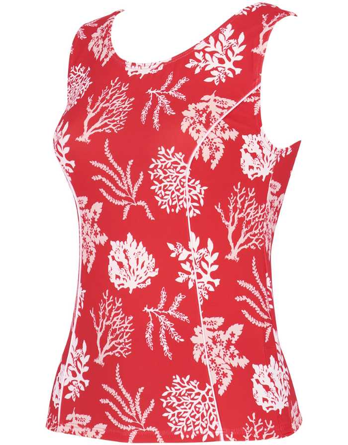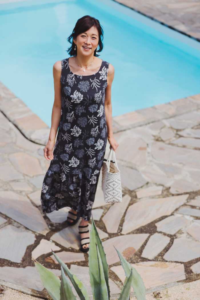 サンゴモチーフの華やかな柄と、体型をさりげなくカバーする設計が特徴。