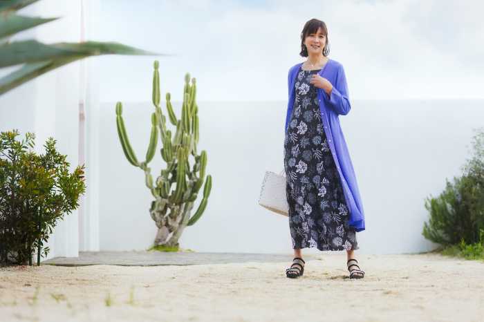 「楊柳前あきワンピース」は27,500円(税込)、カラーはブルー、サイズはM・L。軽やかな楊柳素材で、羽織りとしても使える万能アイテムです。