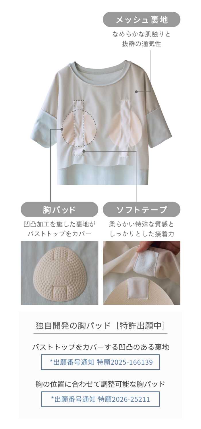 新開発の「調整パッド」は、バスト位置に合わせて自由に調整できるのが特徴。卵型(長さ15cm・横幅14cm)で中央に厚みを持たせた設計により、自然な丸みをキープします。