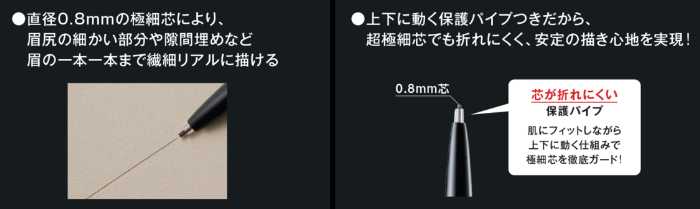 0.8mmの極細芯で、毛流れのような繊細なラインを描けるのが魅力。ウォータープルーフで皮脂やこすれにも強く、自然で美しい眉を長時間キープします。