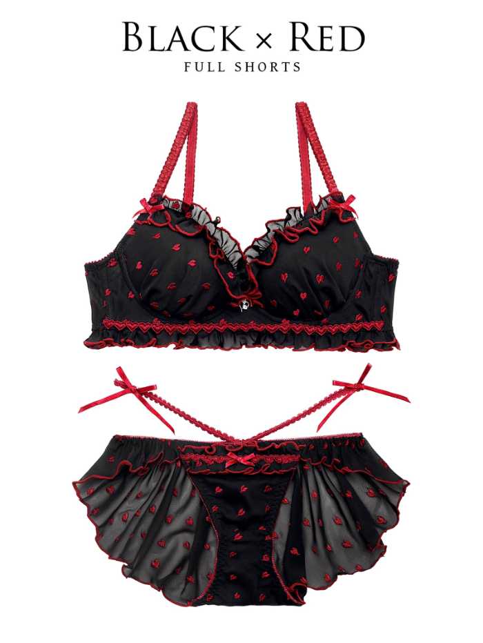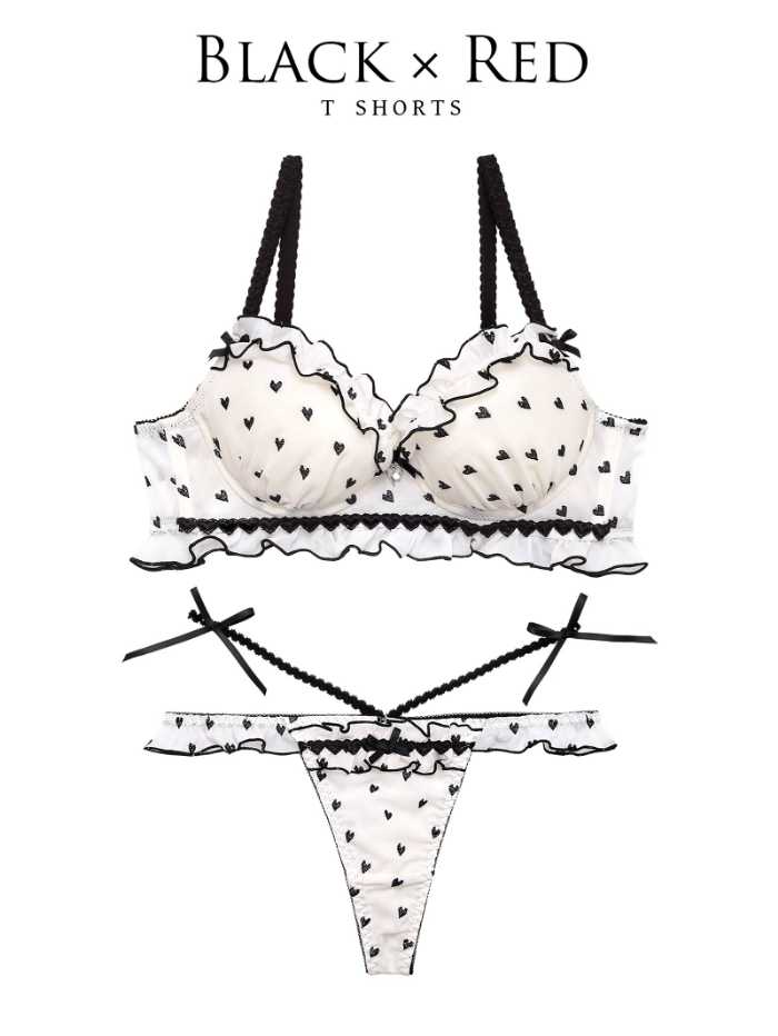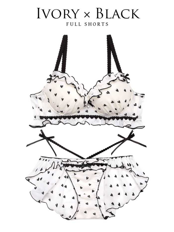 アイボリー×ブラックの新作は、ハート刺繍を散りばめたシフォン素材に、キャンディのようなフリルをプラスした華やかなデザイン。360度どこから見ても可愛く仕上がるディテールが魅力です。