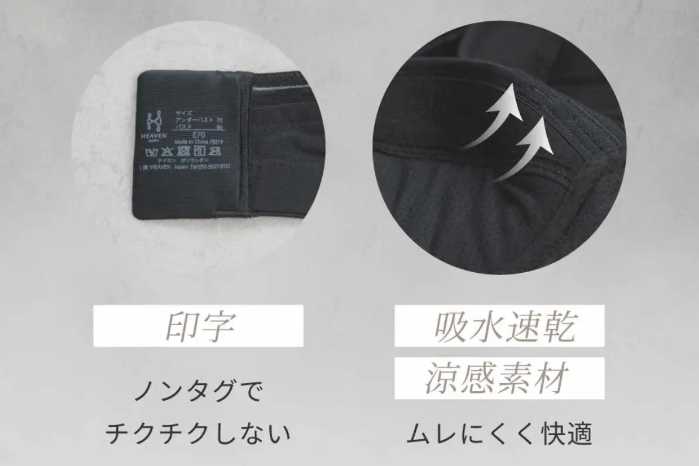 吸水速乾の涼感素材を使用し、汗ばむ季節でもムレにくく快適。洗濯表示は印字仕様で、肌当たりにも配慮されています。