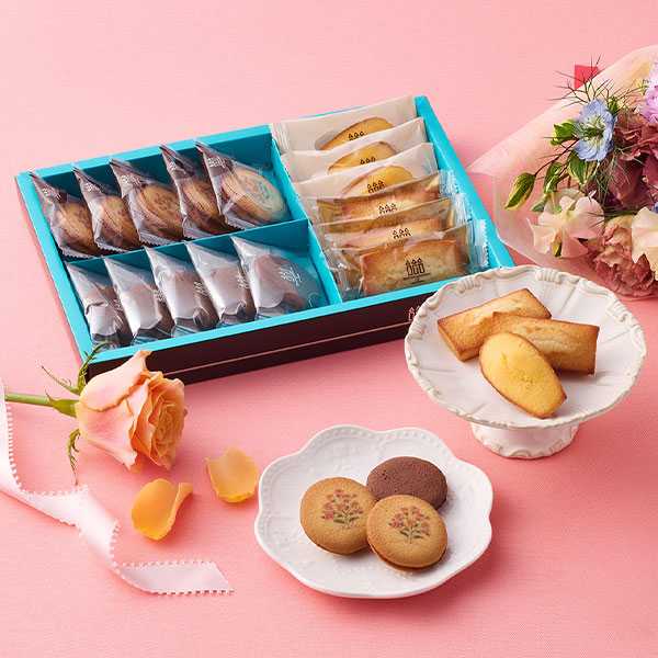 「ラング・ド・シャ・アソート〈ブーケ〉」2,484円(税込)は、フィナンシェ3個、いちごフィナンシェ3個、ラング・ド・シャ10個を詰め合わせた華やかなセット。