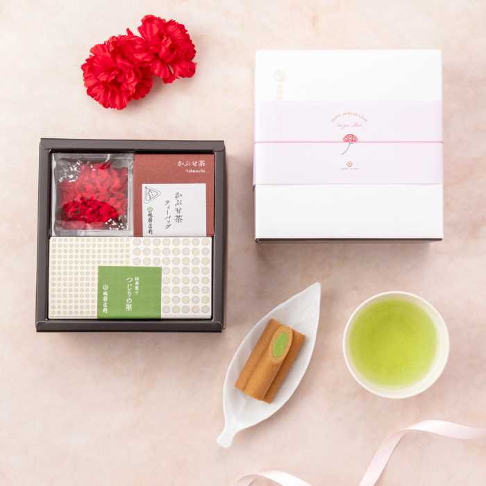 さらに「定番ギフトセット(カーネーション付き)」(3,200円・税込※送料別)は、かぶせ茶ティーバッグ(3g×7P)とつじりの里8本、プリザーブドフラワーをセットに。