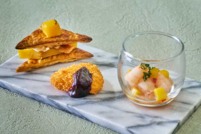 セイボリーは全3種。「パイ生地のミルフィーユピザマンゴーのグリル」「小海老とマンゴーのマリネオリエンタル風」「チーズフライイチゴのコンポート添え」と、フルーツの甘みと塩味の絶妙なバランスが楽しめます。