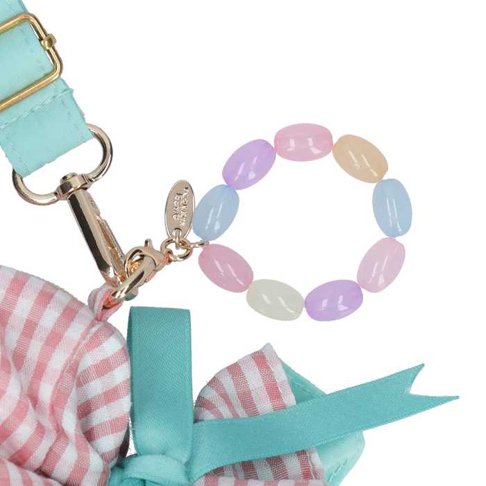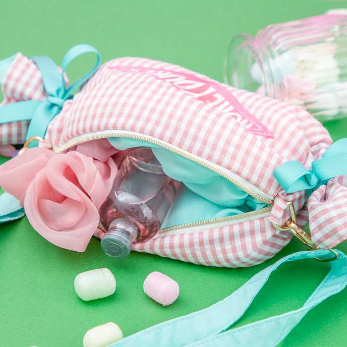 「ハリー・ポッターハニーデュークスキャンディ型ポシェット」は、ピンクのギンガムチェックとミントグリーンのリボンが目を引く愛らしいデザイン。