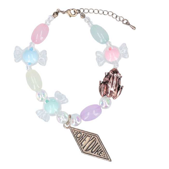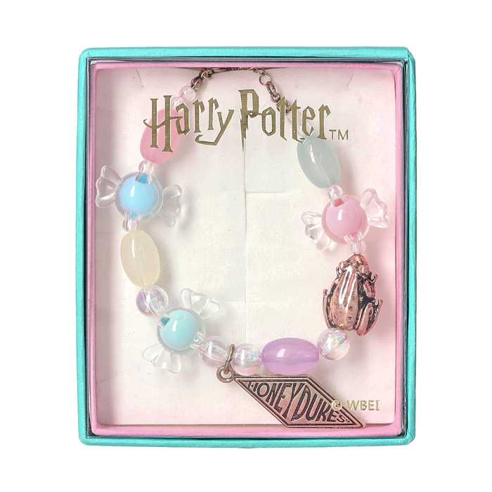 「ハリー・ポッターハニーデュークスブレスレット」は3,300円、サイズは190~225mm。百味ビーンズやキャンディモチーフのビーズに加え、蛙チョコレートやロゴパーツをあしらったデザインが特徴です。