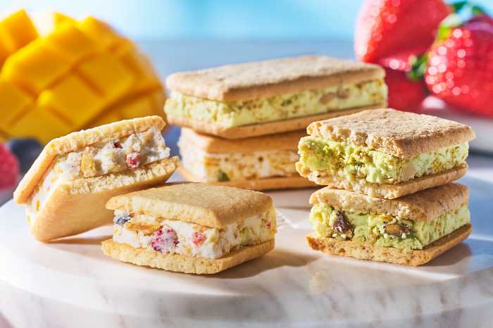 新登場の『果実をたのしむチュイールサンド』は、サクサク食感の軽やかなチュイールにフルーツの風味を閉じ込めた夏限定スイーツ。