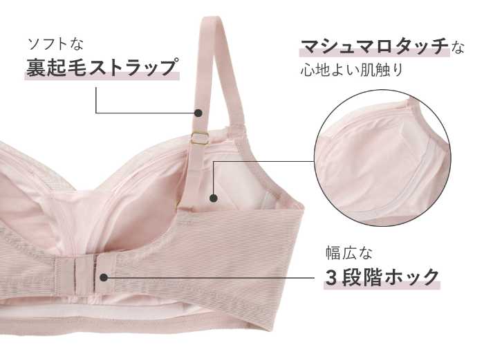 さらに、肌に優しい裏起毛ストラップやマシュマロタッチのカップ素材で、長時間の着用でもストレスフリーに過ごせます。