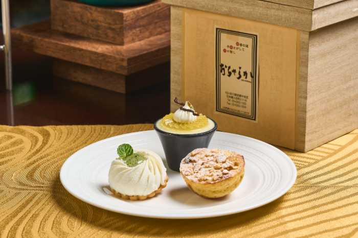 日本茶専門店「おちゃらか」の多彩なお茶とともに、ココアニブジュレほうじ茶ダークチョコレートクリームや、カシス風味の紅茶ゼリーライト煎茶ムースなど、和と洋が融合したスイーツが楽しめます。