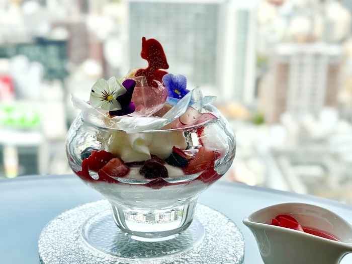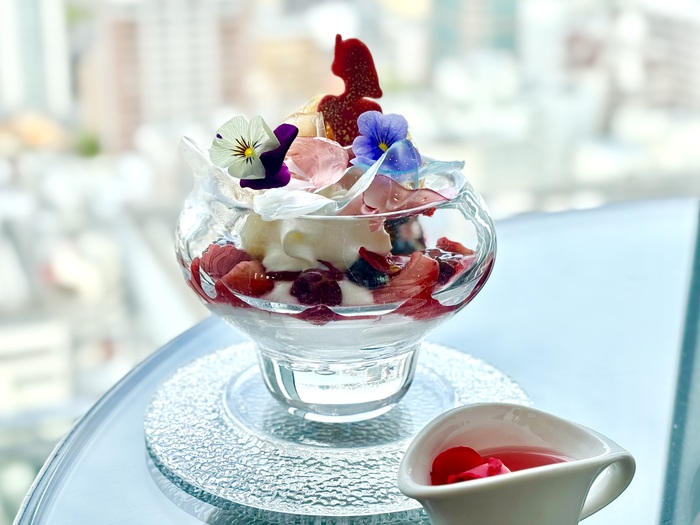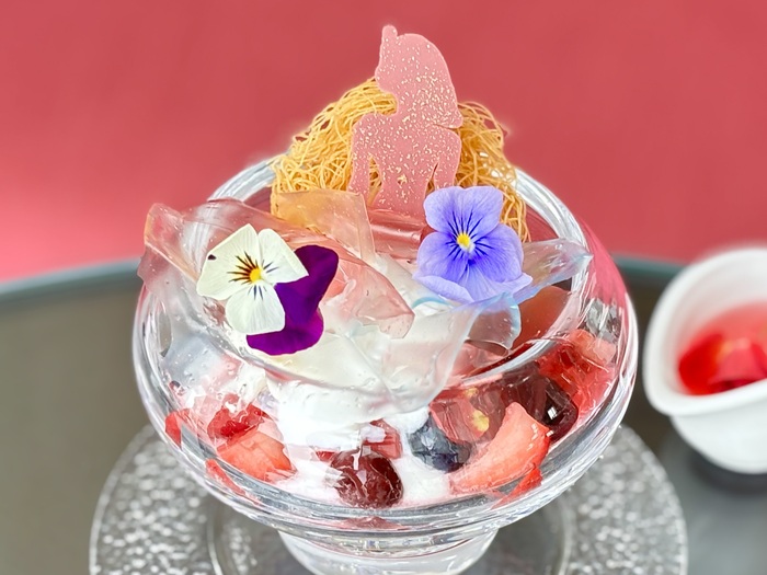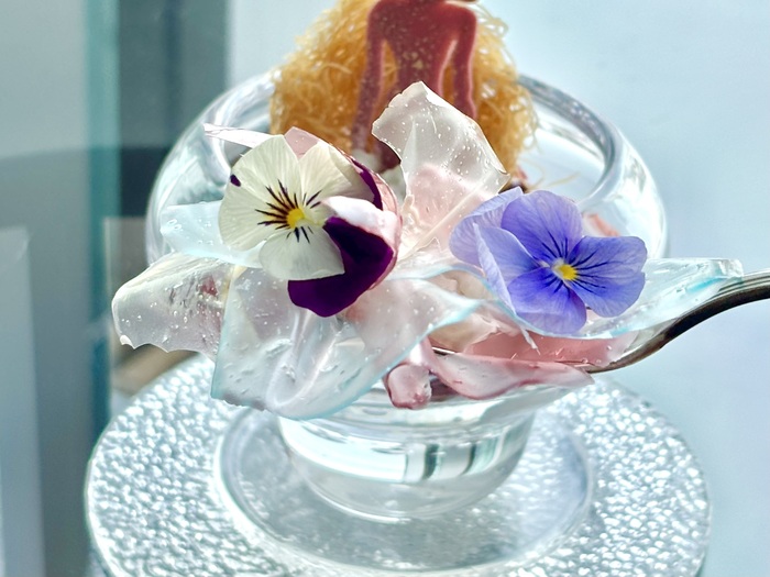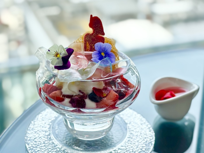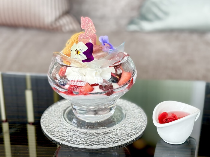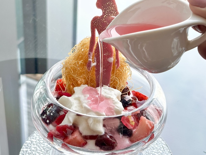 席に届いた瞬間から目を惹くデザート。美と知性、そして魅惑の象徴として、語り継がれたクレオパトラのような華やかさに溢れ、写真に残したくなる美しさ。
