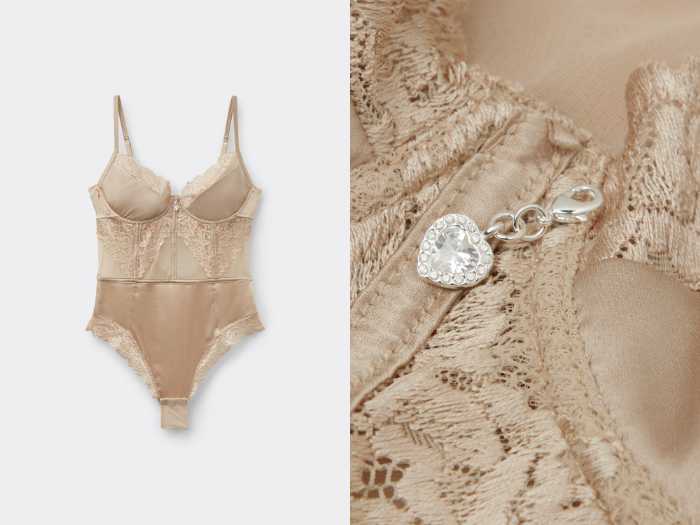 伸縮性のあるシルクサテンにフローラルレースをあしらった華やかな一枚。背中のレースやハート型チャームが、後ろ姿まで美しく演出します。